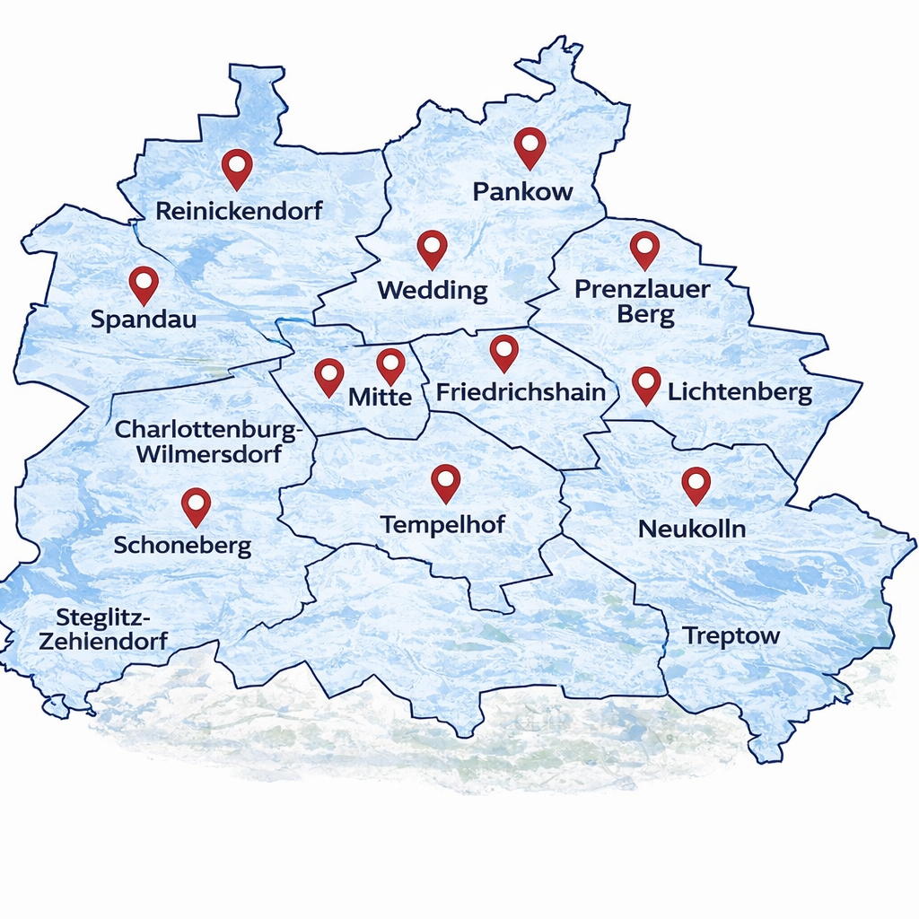 Zynova-Gutachten bietet stolz unabhängige Fahrzeugbegutachtungsdienste in allen wichtigen Bezirken Berlins an. Ob nach einem Unfall, vor dem Fahrzeugkauf oder zur Wertermittlung — unsere Experten sind im gesamten Stadtgebiet für Sie im Einsatz. Wir sind in folgenden Bezirken tätig: